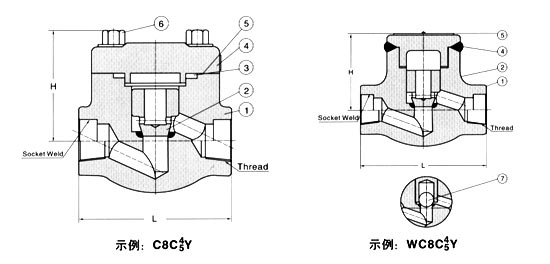 【焊接鍛鋼止回閥】-上海浦蝶閥門有限公司 焊接鍛鋼止回閥H64Y有三種閥蓋設(shè)計(jì)形式。第一種是螺栓式閥蓋,按這種設(shè)計(jì)形式設(shè)計(jì)的閥門,其閥體與閥蓋用螺栓螺母連接,纏繞式墊片(316夾柔性石墨制造)密封?蛻粲刑厥庖髸r(shí)也可采用金屬環(huán)連接。第二種設(shè)計(jì)形式是焊接式閥蓋,按這種設(shè)計(jì)形式的閥門,其閥體與閥蓋用螺紋連接,全焊密封?蛻粲刑厥庖髸r(shí)也可采用全焊透連接。第三種是壓力自緊式閥蓋,按這種設(shè)計(jì)形式設(shè)計(jì)的閥門,其閥體與閥蓋用螺紋連接,內(nèi)壓自密封環(huán)密封。 止回閥存在三種不同的設(shè)計(jì)結(jié)構(gòu),它們是升降式止回閥、球式止回閥和旋啟式止回閥。 1.【焊接鍛鋼止回閥】設(shè)計(jì)結(jié)構(gòu)和特征 止回閥的設(shè)計(jì)與制造符合MSSP-118和ASME B16.34。檢驗(yàn)與測(cè)試按API 598,標(biāo)記按MSS-SP-25。 2.【焊接鍛鋼止回閥】結(jié)構(gòu) 全徑或縮徑 升降式止回閥 球式止回閥 旋啟式止回閥 按需求內(nèi)置彈簧 螺栓連接、纏繞墊片密封式閥蓋;螺紋連接、全焊密封式閥蓋以及螺紋連接內(nèi)壓自緊式閥蓋 整體式上密封座 承插端符合ASME B16.11 螺紋連接端(NPT)符合ANSI/ASME B1.20.1 閥瓣可變換為節(jié)流型、針型、球型 【焊接鍛鋼止回閥】 4.【焊接鍛鋼止回閥】標(biāo)準(zhǔn)材質(zhì)明細(xì)表 序號(hào) | 零件名稱 | CS to ASTM | AS to ASTM | SS to ASTM | Type A105N | Type F22 | Type F304(L) | Type F316(L) | 1 | 閥體 | A105N | A182 F22 | A182 F304(L) | A182 F316(L) | 2 | 升降式 閥瓣 | A276 420 | A276 304 | A276 304(L) | A276 316(L) | 3 | 墊片 | 316夾 柔性石墨 | 316夾PTFE | 4 | 閥蓋 | A105N | A182 F22 | A182 F304(L) | A182 F316(L) | 5 | 銘牌 | SS | 6 | 螺栓 | A193 B7 | A193 B16 | A193 B8(M) | A193 B8(M) | 7 | 球 | A182 F420/STL | A182 F304 | A182 F304 | A182 F304 | 適用介質(zhì) | 水、蒸汽、油品等 | 水、蒸氣、油品等 | 硝酸、醋酸等 | 適用溫度 | -29°C~425°C | -29°C~550°C | -29°C~200°C |