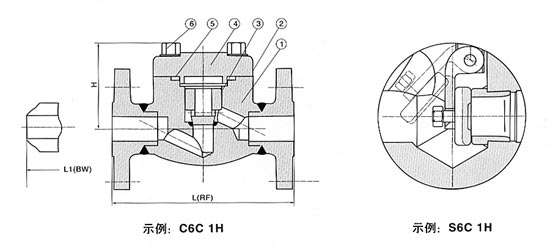 注意:客戶需求的其他材質(zhì)也可采用。密封面材料配對由客戶指定內(nèi)件代號決定。 CS=碳鋼;AS=合金鋼;SS=不銹鋼; 4.【鍛鋼法蘭止回閥】鍛鋼法蘭止回閥尺寸(mm)和重量(Kg) NPS | 1/2 | 3/4 | 1 | 11/4 | 11/2 | 2 | L(RTJ) L1(BW) | 150 | 108 | 117 | 127 | 140 | 165 | 203 | 300 | 152 | 178 | 203 | 216 | 229 | 267 | 600 | 165 | 190 | 216 | 229 | 241 | 292 | H | 150,300 | 61 | 61 | 79 | 95 | 103 | 118 | 600 | 61 | 79 | 95 | 103 | 118 | 135 | 重量 | 150 | RTJ | 2.56 | 3.37 | 4.37 | 8.17 | 8.94 | 12.64 | BW | 1.70 | 1.90 | 2.10 | 5.12 | 5.50 | 7.89 | 300 | RTJ | 2.73 | 3.65 | 4.74 | 8.77 | 9.60 | 13.70 | BW | 1.90 | 2.10 | 3.00 | 5.12 | 6.60 | 7.85 | 600 | RTJ | 3.00 | 4.00 | 5.83 | 9.47 | 10.10 | 15.6 | BW | 2.00 | 3.12 | 4.25 | 7.25 | 8.56 | 13.60 |