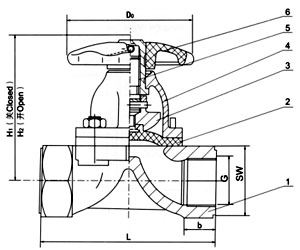 部件列表:1.閥體 2.隔膜 3.閥瓣 4.閥桿 5.閥蓋 6、手輪 2.【內(nèi)螺紋隔膜閥】用途: 內(nèi)螺紋隔膜閥專用于控制一般腐蝕性介質(zhì),可供各類管路或設(shè)備上作啟閉及節(jié)流用。 適用溫度:≤120℃、≤150℃(按照隔膜材料) 壓力等級:PN(MPa) 0.6 1.0 1.6 3.【內(nèi)螺紋隔膜閥】部件材料: 閥體:鑄鐵、球墨鑄鐵、碳鋼、不銹鋼 閥蓋:鑄鐵、球墨鑄鐵、碳鋼、不銹鋼 隔膜:橡膠 閥瓣:鑄鐵、不銹鋼 閥桿:碳鋼、不銹鋼 手輪:鑄鐵 4.【內(nèi)螺紋隔膜閥】實驗測試: 襯里層:電火花檢測 試驗與檢驗按BS6755標(biāo)準(zhǔn) 公稱壓力:PN(MPa) 閥體:PN×1.5 密封:PN×1.1 5.【內(nèi)螺紋隔膜閥】主要尺寸: 公稱通徑 | 公稱壓力 MPa | 工作壓力 MPa | L mm | SW mm | b mm | H1 mm | H2 mm | D0 mm | 質(zhì)量 Kg/kilos | DN | G | 8 | 1/4 | 1.6 | 1.6 | 50 | 20 | - | 60 | 66 | 45 | 0.6 | 10 | 3/8 | 50 | 24 | - | - | - | 45 | 0.7 | 15 | 1/2 | 65 | 38 | 8 | 84 | 92 | 50 | 0.8 | 20 | 3/4 | 85 | 40 | 12 | 93 | 103 | 50 | 1.1 | 25 | 1 | 110 | 48 | 18 | 106 | 120 | 66 | 1.9 | 32 | 1 1/4 | 120 | 58 | 18 | 137 | 156 | 96 | 3.3 | 40 | 1 1/2 | 140 | 69 | 18 | 142 | 163 | 96 | 4.2 | 50 | 2 | 165 | 85 | 20 | 167 | 192 | 96 | 5.8 | 65 | 2 1/2 | 1.0 | 203 | 60 | 20 | 190 | 225 | 165 | 9.5 | 80 | 3 | 254 | 105 | 32 | 206 | 246 | 230 | 16.2 |