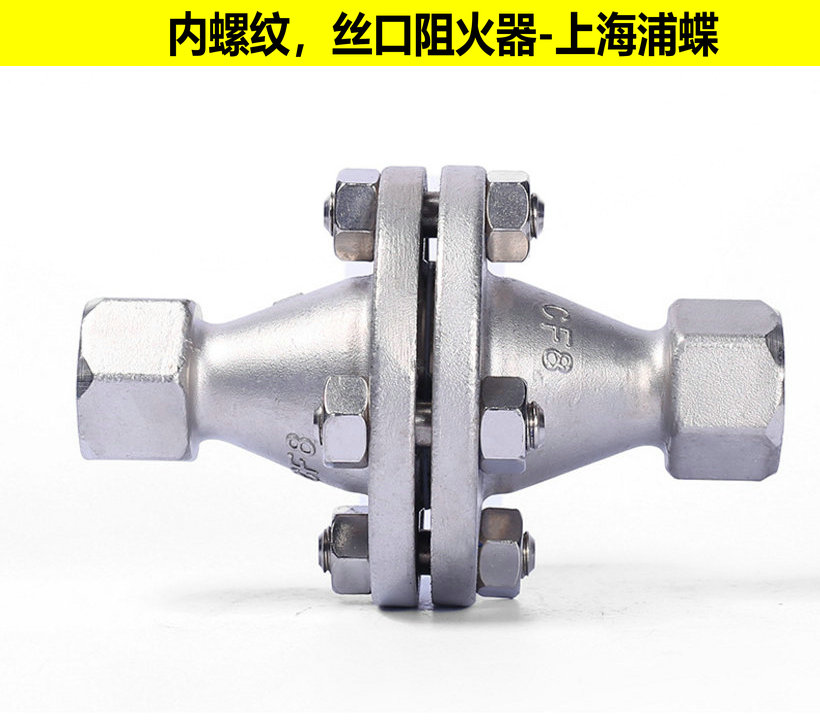 【內(nèi)螺紋阻火器】-上海浦蝶閥門有限公司 產(chǎn)品型號(hào):ZGB 產(chǎn)品口徑:DN15-32 產(chǎn)品壓力:1.0-4.0MPa 產(chǎn)品材質(zhì):鑄鋼、不銹鋼等 1.【內(nèi)螺紋阻火器】使用范圍: ◆阻火器適用于儲(chǔ)存閃點(diǎn)低于28℃的甲類油品和閃點(diǎn)低于28℃的乙類油品,也適用于儲(chǔ)存物料以氮?dú)夥忭數(shù)墓绊敼奚,礫石阻火器與網(wǎng)型阻火器原理同上,用在管道上。 ◆與呼吸閥、呼吸人孔配套使用,也可單獨(dú)使用。 2.【內(nèi)螺紋阻火器】技術(shù)要求: ◆阻爆性能合格,連續(xù)十三次試驗(yàn)每次都能阻火。 ◆耐火性能合格,耐燒,1小時(shí)無(wú)回火。 3.【內(nèi)螺紋阻火器】保養(yǎng)與維修: 為了確保阻火器的性能達(dá)到安全使用目的,對(duì)阻火器應(yīng)定期檢查、保養(yǎng)。 ◆阻火器每半年檢查一次,檢查阻火層芯子是否堵塞、變形、腐蝕等。 ◆發(fā)現(xiàn)被堵塞的阻火層芯子應(yīng)清洗干凈,確保芯子上的每個(gè)孔眼暢通,對(duì)于變形和腐蝕的阻火層應(yīng)更換。 ◆重新安裝阻火層芯子時(shí),應(yīng)保證結(jié)合面嚴(yán)密不得漏氣。