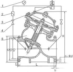 5.【安全泄壓閥AX742X】主要零件材料 零件名稱 零件材料閥體 閥蓋WCB閥座 閥盤銅合金/2Cr13密封圈 O型圈丁腈橡膠閥桿2Cr13彈簧50CrVA缸套 活塞(活塞型)2Cr13膜片(膜片型)夾織物丁腈橡膠調(diào)節(jié)閥 球閥銅合金過濾器不銹鋼 | | 部件列表: 1、壓力表2、過濾器3、控制導(dǎo)閥4、流量調(diào)節(jié)閥5、主閥 6.【安全泄壓閥AX742X】安裝示意圖